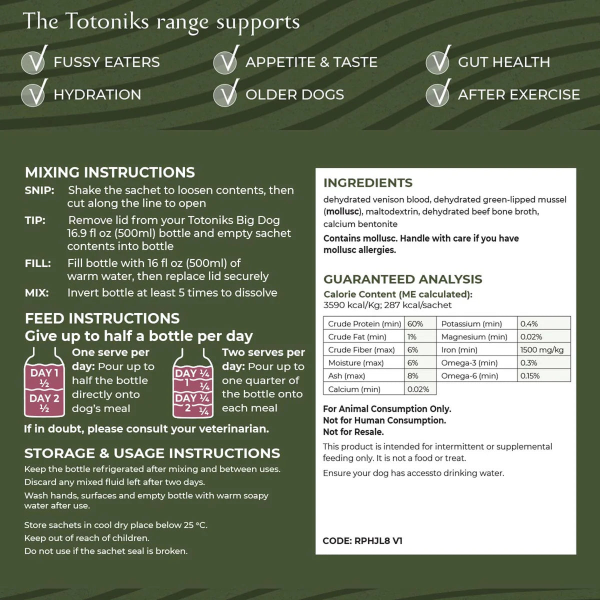 For Animal Consumption Only. Not for Human Consumption. Not for Resale. This product is intended for intermittent or supplemental feeding only. It is not a food or treat. Ensure your dog also has access to drinking water.
